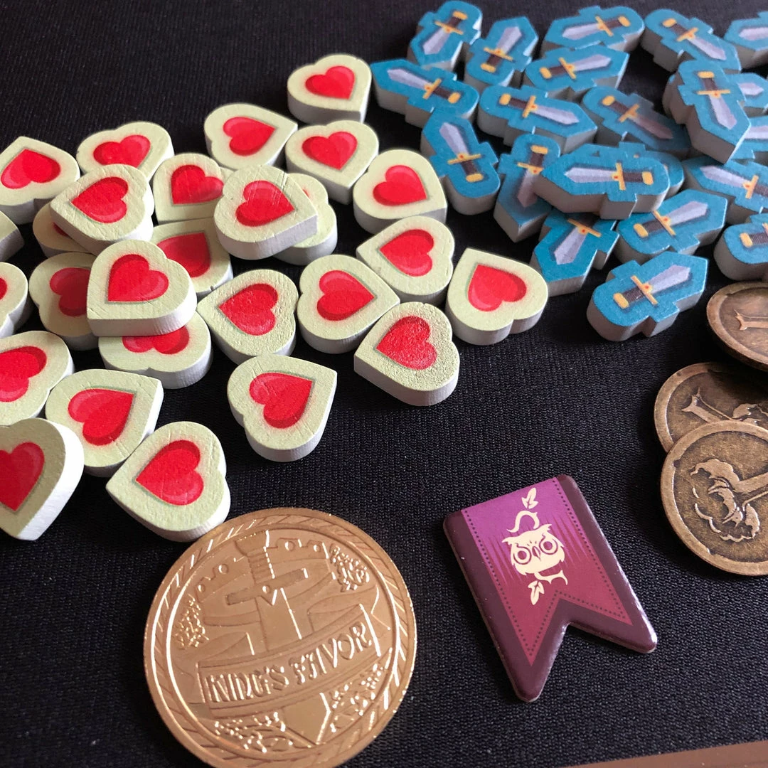Deluxe edition of Kingswood. This version contains everything in the regular edition ofΒ KingswoodΒ and theΒ Kingswood: Kickstarter Promos, which features a King’s Favor coin, bonus location (Docks), and bonus character guild (Panzoo Tapestry). The component upgrades include wooden resource tokens (swords, hearts, spell books)and metal coin set.