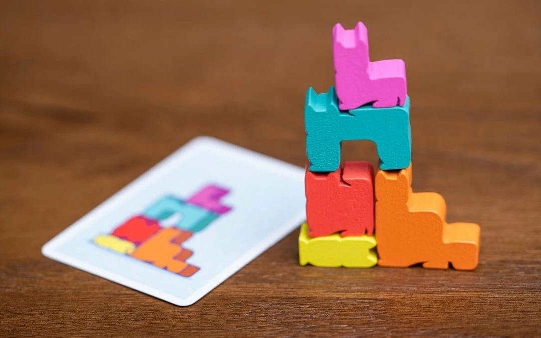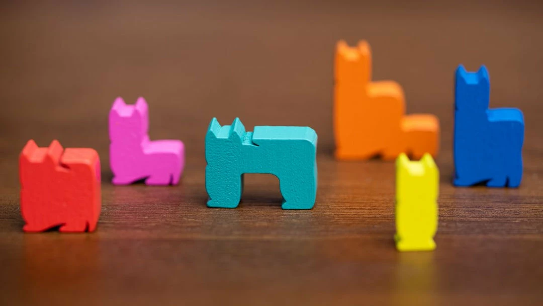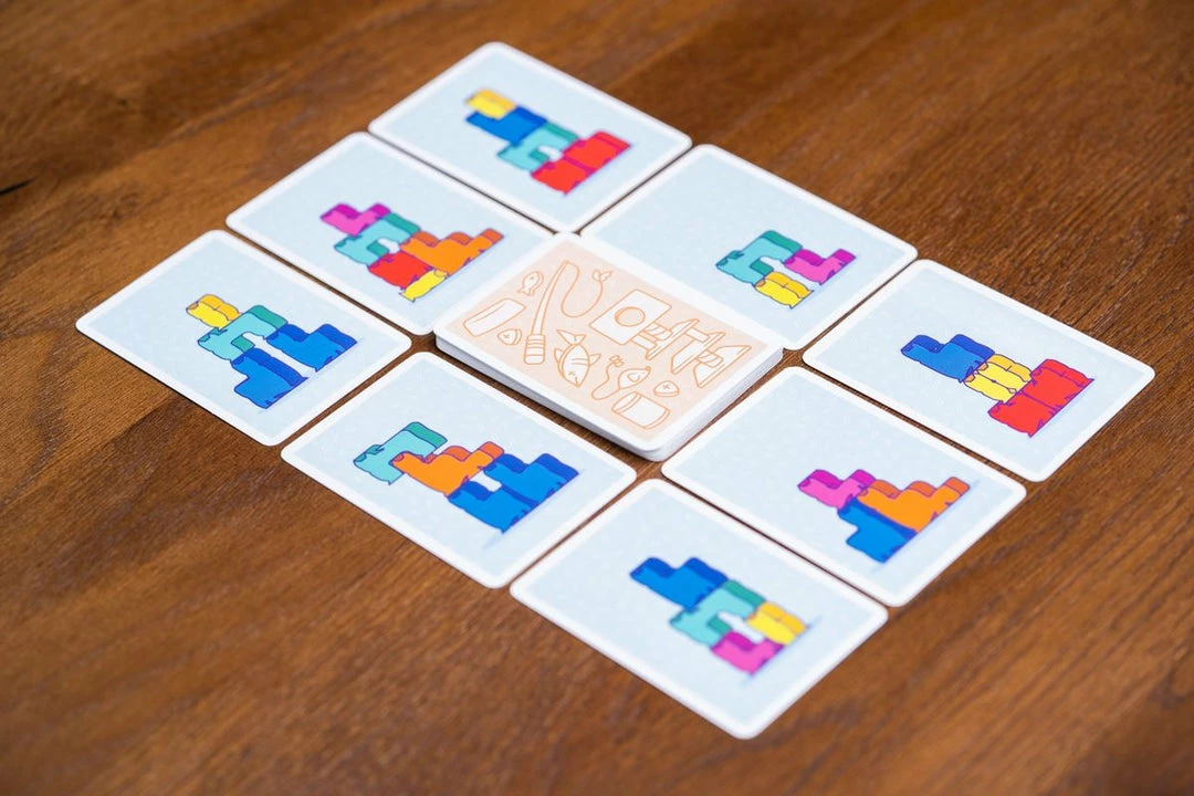 In Kittin, you’ll flip a card then all players will compete in a simultaneous fast-paced race to grab the cat meeples and match the arrangement. The player who is quickest at grabbing and best at stacking will win the cat-stacking race!