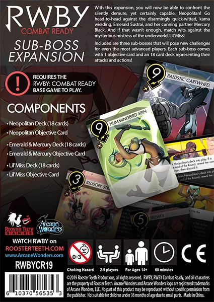RWBY Combat Ready Sub-Boss ExpansionΒ adds 3 new objectives, and an 18 card deck for each objective.