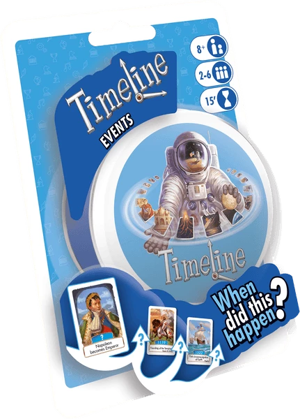 Timeline: Events is a card game played using 55 cards. Each card depicts a historical event on both sides, with the year in which that event occurred on only one side. Players take turns placing a card from their hand in a row on the table. After placing the card, the player reveals the date on it. If the card was placed correctly with the date in chronological order with all other cards on the table, the card stays in place; otherwise the card is removed from play and the player takes another card from the deck.