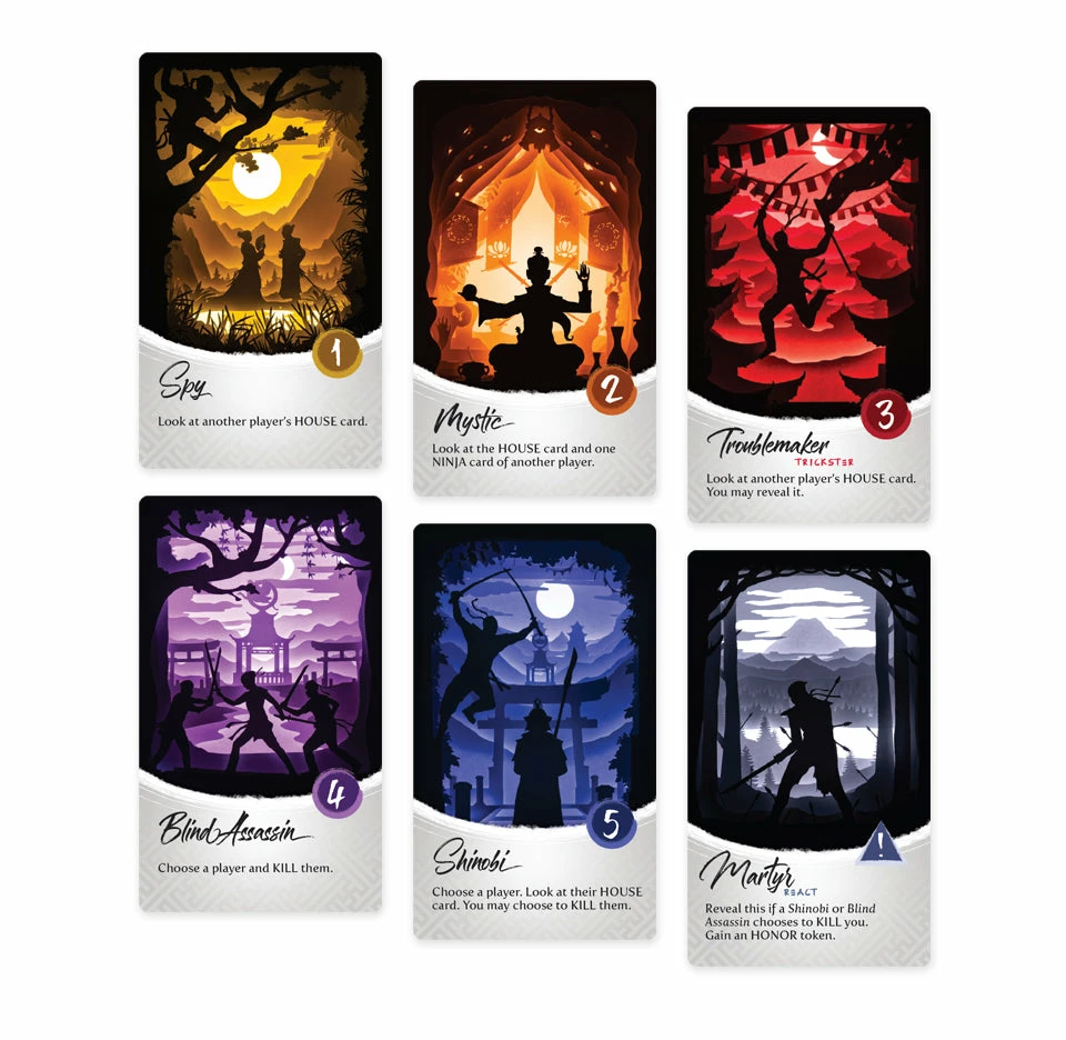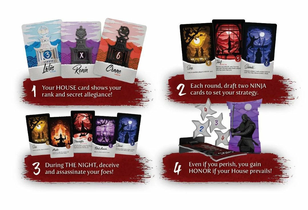 Night of the Ninja offers several twists on the social deduction genre. The team-based play means you can win Honor even if you die, as long as your House prevails. Each round begins by drafting Ninja cards, and no role is strictly better than others. The deadliest cards are also the last to be played, and gathering information can be as valuable as assassinating another player.