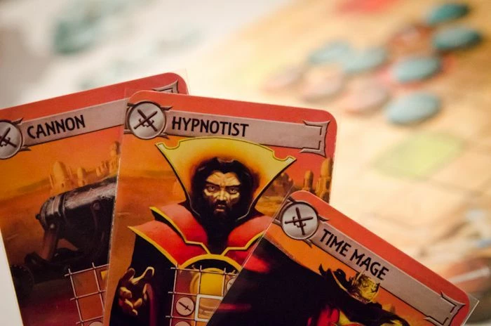The game includes four different factions, each with a unique deck of beings to summon and one deck of legendary creatures. Players take turns placing their common pieces on the board, and if they succeed in creating patterns depicted on one of the cards in hand, they may play it. When played, the card summons a particular being and allows the player to perform an effect described on the card: a giant destroys neighboring pieces, a knight moves through enemy pieces, a warlord orders previously placed pieces to move and fight, an enchantress converts enemy pieces to player’s own color, etc. After that, the player discards the card and the summoned being turns into a motionless piece which may be used in patterns for summoning other beings β or even be awakened and moved into combat by the effects of other cards.