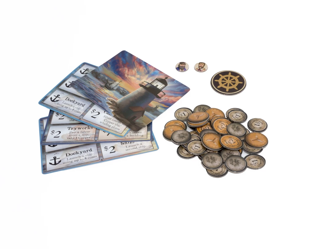 Set in the mid-1800s, the golden age of whaling, New Bedford gives you the chance to build the Massachusetts town of the same name into a thriving whaling community. Gather resources to add buildings with new actions and launch ships to go whaling. Go out longest for the best choice, but wait too long and the whales become harder to catch. And don’t forget to pay your crew when ships return! Carefully balance time management and timing to earn the most points in this medium-weight worker placement and resource management game.
