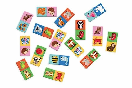 Cadomino begins with all dominoes spread out on the table with the animal faces visible. The cards are in a pile, face-down. A card is turned over to show an animal (starting point), a color (ending point), and the gift to be found. To find the animal hiding the gift, players silently work it out on their own. Each player follows the movement of the animals to arrive at the desired color. Once the animal has been identified, the fastest player places their finger on that animalβs square and the domino is flipped over! If itβs the right animal, the gift is hidden behind it and the player wins the card!