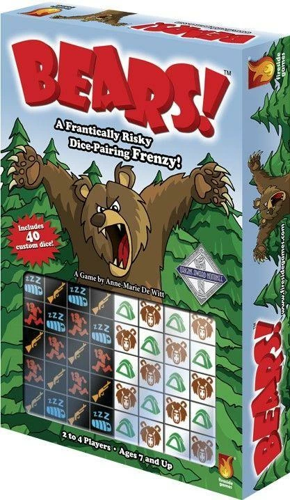 Bears! is a fast-playing, competitive game in which you score points by pairing dice. Shoot bears and run from tents for a few points, or take a risk and score big by sleeping through the attack! But watch out! If any bears remain at the end of the round, your sleeping campers are done for!