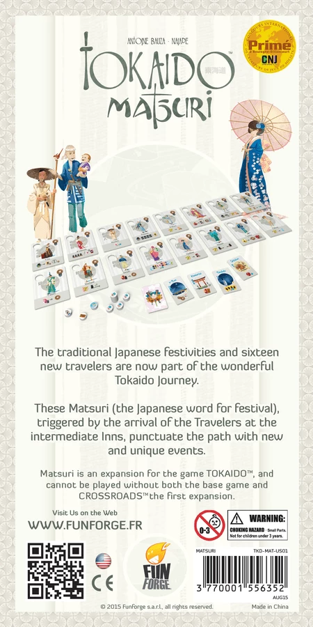 MatsuriΒ is aΒ TokaidoΒ expansion that brings new cards and tokens to the game. With this expansion, the players live the Japanese feasts and festivals. These cards modify the way each section of the road is played. This doesn’t transform the game, but adds even more depth and strategy in the same way thatΒ CrossroadsΒ did.