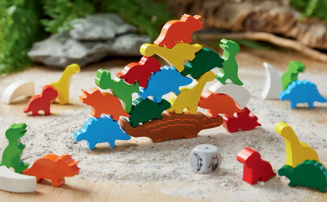 Each turn in Animal Upon Animal: Dinosaurs, a player rolls the die, then places either one or two animals on the stack of animals, passes one of their animals to another player for them to place, or places an animal on the table, extending the base for other players to build upon. If any pieces fall off while you are building, you must take up to two of them back. The first player to have no animals in front of them wins.