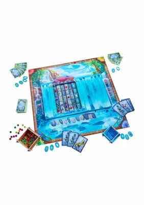 The Inox people have been living peacefully in the Land of the Waterfalls for a long time, but now there is a dangerous threat. Evil Rhujas roaming the land want to capture the gemstones of the Inox. That’s why the Inox have selected the hardest to reach and most dangerous place to hide their gemstones: the rock wall behind the IquazΓΊ waterfall. Their water dragon Silon blocks the waterfall so that the brave Inox can rappel down the rock wall behind it to place their gemstones there, out of harm’s way. The gushing water and the dangerous water snakes at the bottom will stop the Rhujas from getting the gemstones. Which player inΒ IquazuΜΒ will manage to use their cards skillfully and place their colored gemstones in the best spots?