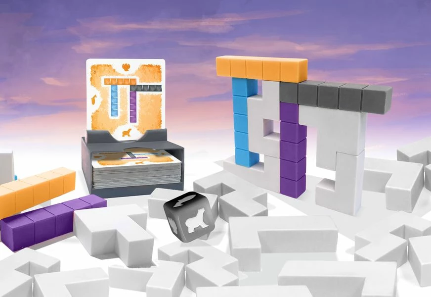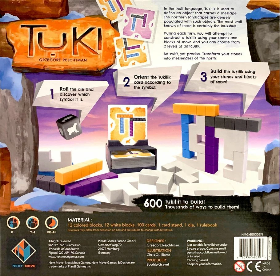 During each turn inΒ Tuki, you attempt to construct an inukshuk based on the die face rolled using your stones and blocks of snow. Players have only a limited number of pieces with which to construct the inukshuk, so you’ll need to be creative and use the three-dimensional pieces in multiple ways, such as to counterbalance other pieces or even build on top of existing pieces. A solution always exists β you just need to discover it!