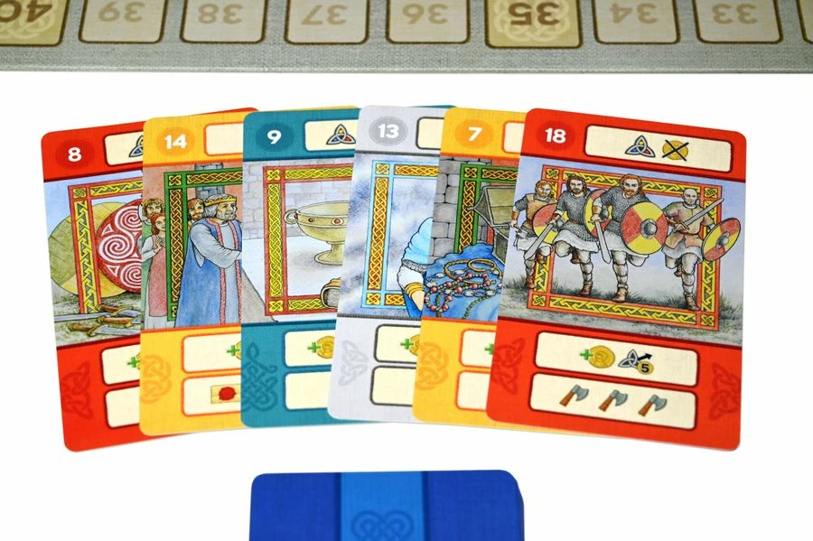 The success of the historical Brian Boru rested on three pillars: his victories against the Vikings, the favor he managed to garner with the Church, and the alliances he forged through political marriages. This became the foundation of the game, with each pillar becoming a suit in the trick-taking that forms the core of the mechanisms. Win a trick and you gain influence in a town, which, in turn, gains you majorities in the regions; if you lose the trick, however (deliberately or otherwise), you instead take an action corresponding to the suit of the card.
