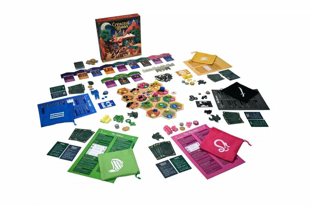 Crescent MoonΒ is an area control game for four or five players. Take on the role of one of five radically asymmetric characters, each with their own objectives to fulfil, unique actions to utilise, and game-changing special powers to employ. Build symbiotic relationships with your allies, undermine your rivals, and choose your friends and enemies wisely in this cut-throat game of power and politics.