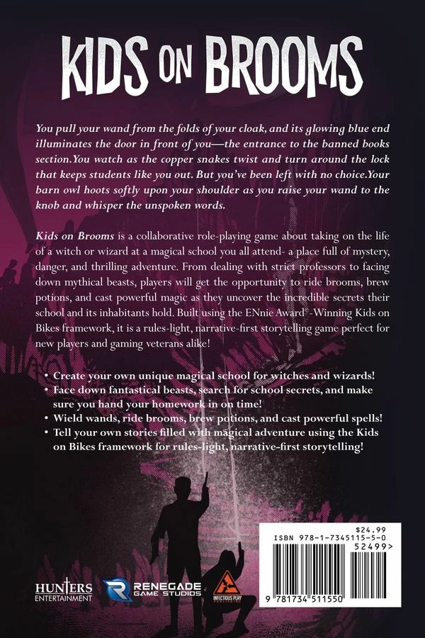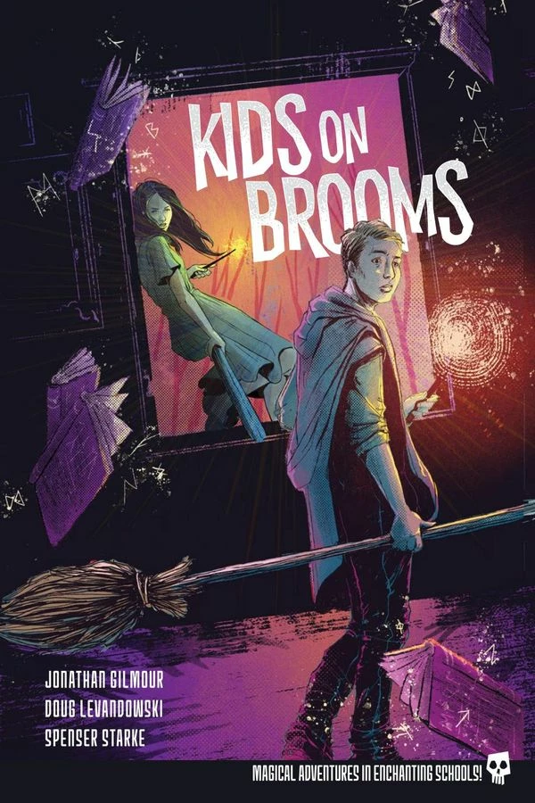| You pull your wand from the folds of your cloak, and its glowing blue end illuminates the door in front of you-the entrance to the banned books section. You watch as the copper snakes twist and turn around the lock that keeps students like you out. But you’ve been left with no choice. Your barn owl hoots softly upon your shoulder as you raise your wand to the knob and whisper the unspoken words. Kids on Brooms is a collaborative role-playing game about taking on the life of a witch or wizard at a magical school you all attend- a place full of mystery, danger, and thrilling adventure. From dealing with strict professors to facing down mythical beasts, players will get the opportunity to ride brooms, brew potions, and cast powerful magic as they uncover the incredible secrets their school and its inhabitants hold. Built using the ENnie Award-Winning Kids on Bikes framework, it is a rules-light, narrative-first storytelling game perfect for new players and gaming veterans alike! |