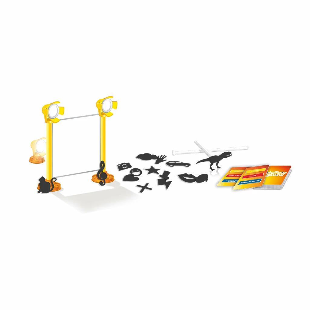 Just with shadow puppetry! Use the magnetized shapes at the tip of your sticks and use the shapes to create shadows and form images that are projected onto a translucent screen using light. The shapes can be animated and you may also add noises to help your team mates. Have your teammates guess the right word or expression, or drawn reference. Beware though, your time is limited!